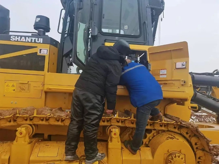 整個交機的過程,都被旁邊一直關注的設備老板看在眼里??吹接羞@么敬業(yè)的山推服務,可以不論時間的早晚,可以不顧疾風驟雪的侵襲,帶著一股子對工作充分負責的“拼勁兒”,作為客戶除了對山推的設備除了放心還是放心??蛻舯硎荆鹤钅苄欧倪€是山推的服務,只要有山推服務人員在,定能讓設備性能盡情的施展。