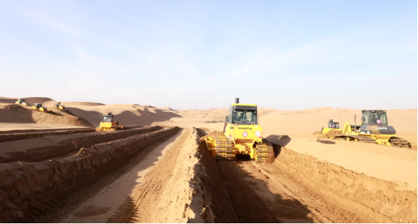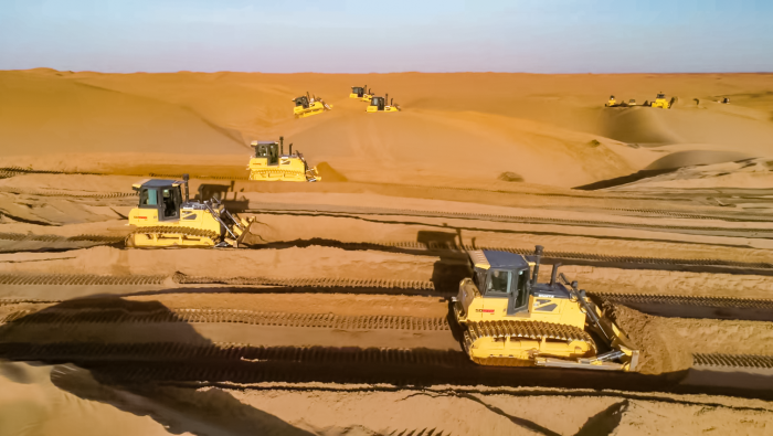 當(dāng)小分隊(duì)越過最后一道沙脊,廣闊平整的工程場(chǎng)地便映入眼簾,飛揚(yáng)的風(fēng)沙之中由上百臺(tái)山推推土機(jī)組成的“鋼鐵馬群”往來奔馳,高效進(jìn)行著場(chǎng)地平整作業(yè),為這片沉寂的沙漠帶來喧囂生機(jī)。