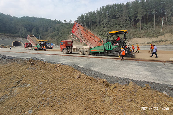 山推SRP09-C5 MA攤鋪機(jī),雙機(jī)聯(lián)鋪助力貴州某高速道路建設(shè),施工路段約30公里,作業(yè)寬度為12m,作業(yè)厚度300mm,作業(yè)速度快,施工質(zhì)量高,獲得監(jiān)理的的一致好評(píng)。