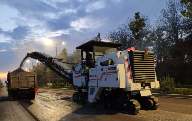 夕陽西下,華燈初上。G327國(guó)道路面翻新工程,5公分瀝青面層銑刨,行走速度可達(dá)20m/min左右。