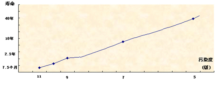 世界各研究機(jī)構(gòu)在進(jìn)行研究污染度對(duì)壽命的影響時(shí),所給出的研究結(jié)果差異很大,這主要是因?yàn)楣ぷ鳝h(huán)境、污染物成分及顆粒硬度等因素不同的結(jié)果。一般來說(以NAS1638標(biāo)準(zhǔn)),污染度降低一級(jí),壽命延長一倍,反之亦然。假定使用污染度為7級(jí)(NAS1638)的油液,機(jī)器的壽命為10年,同樣是這樣一臺(tái)機(jī)器將油液的污染度降低幾級(jí),壽命就有驚人的變化。